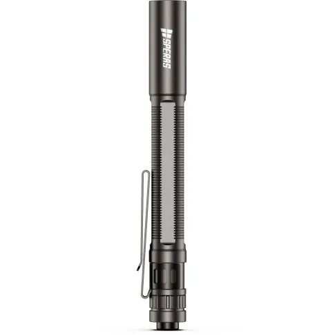 Latarka LED Speras M10 Plus Grey (SPERAS M10 PUS GREY) ze względu na swój kształt to tzw. latarka długopisowa przeznaczona do działań, wymagających intensywnego światła. Jest również idealnym uzupełnieniem ekwipunku EDC dla miłośników militariów. Ta konstrukcja jest większą wersją latarki Speras M10. Dzięki nowoczesnej budowie i najnowocześniejszym technologiom otrzymujemy doskonałą latarkę o imponujących osiągach, pomimo jej kompaktowych rozmiarów. Jednocześnie jest odpowiednia dla preppersów, policjantów lub na piesze wycieczki. Latarka Speras została wykonana z wytrzymałego stopu aluminium lotniczego i pokryta anodyzowaną warstwą ochronną wykończoną w kolorze szarym.