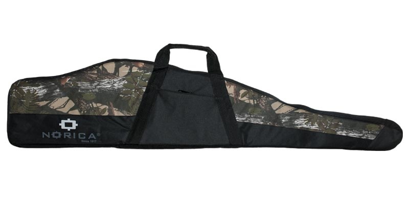 Pokrowiec na broń Norica Black Camo (191.00.006) to prosta aczkolwiek mocna konstrukcja wykonana w 100% z nylonu. Pokrowiec nadaje się do przenoszenia karabinków pneumatycznych, replik asg a nawet broni myśliwskiej o odpowiednich wymiarach wraz z zamontowaną lunetą. Transportowany karabinek chroniony jest wartswą pianki, która absorbuje uderzenia. Na zewnątrz użyto wzmacnianego nylonu, który chroni przed rozdarciem, a nawet w dużym stopniu przed opadami. Tam też naniesiono logo producenta. Część pokrowca stanowi materiał w specjalnym kamuflażu imitującym naturalne otoczenie w lesie, tj. liście, gałęzie itd.